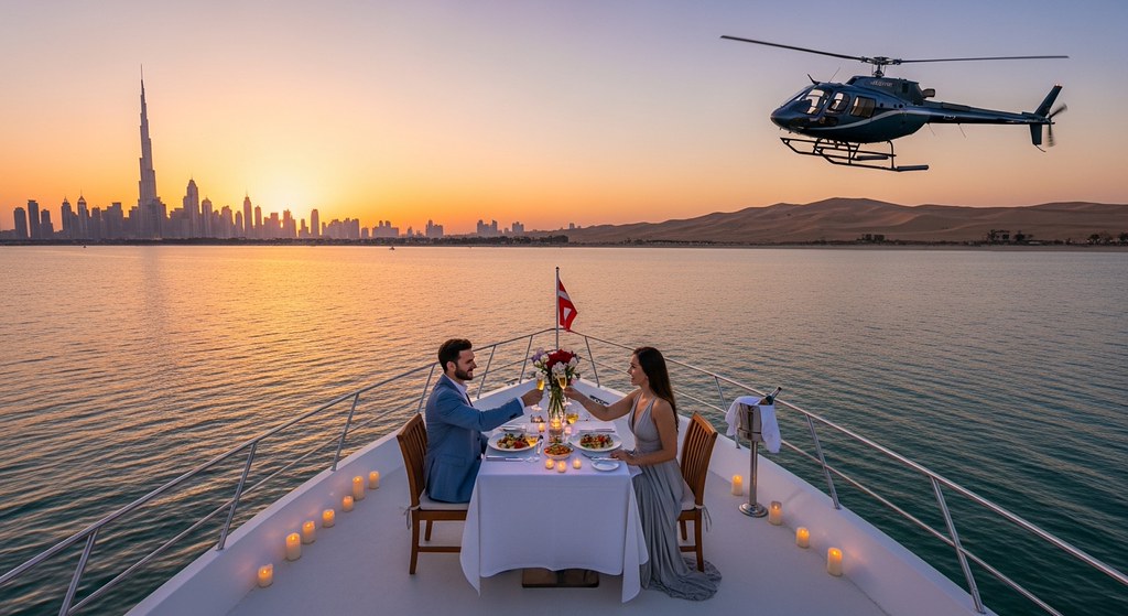 Типичная ошибка. Пары думают, что романтика — это ресторан с видом. Приезжают в Burj Khalifa, заказывают столик у окна, а по факту получают стекло, за которым стройка и очередь из таких же туристов с айфонами. В Дубае не работает «сесть и смотреть». Здесь работает «быть внутри». Яхта, вертолёт, открытая терраса в пустыне — это не просто вид, это смена угла обзора.
